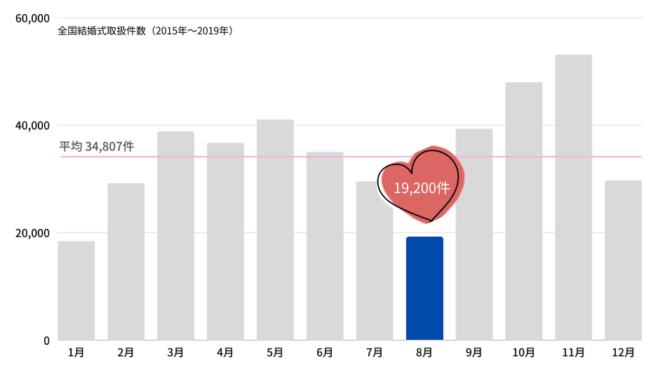 上記のグラフのように、5月をピークに挙式件数は減少し、8月は19,200件と年間を通して最も挙式件数が少ない月の一つとなっています。
