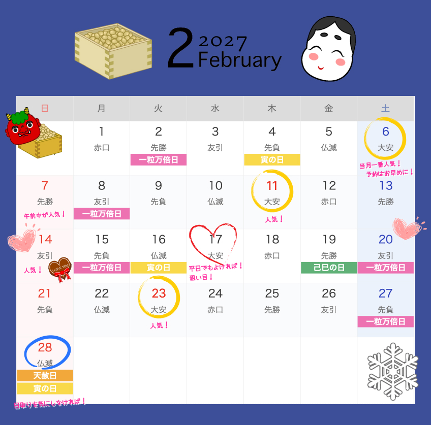2026年の2月は吉日が休日と重なる日が多く、選びやすい月です。