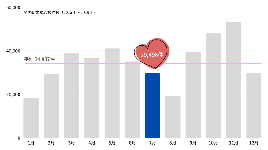 7月の挙式件数についてみてみましょう。上記のグラフのように5月をピークに挙式件数は減少し、7月は29,496件と年間を通してみても、少ない月となっています。