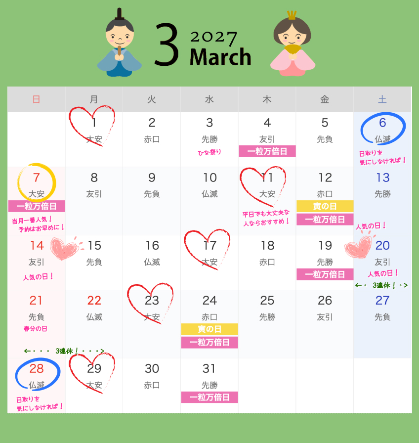 2027年の3月は週末の大安が少なく、前半の大安と後半の3連休に予約が集中しそう!