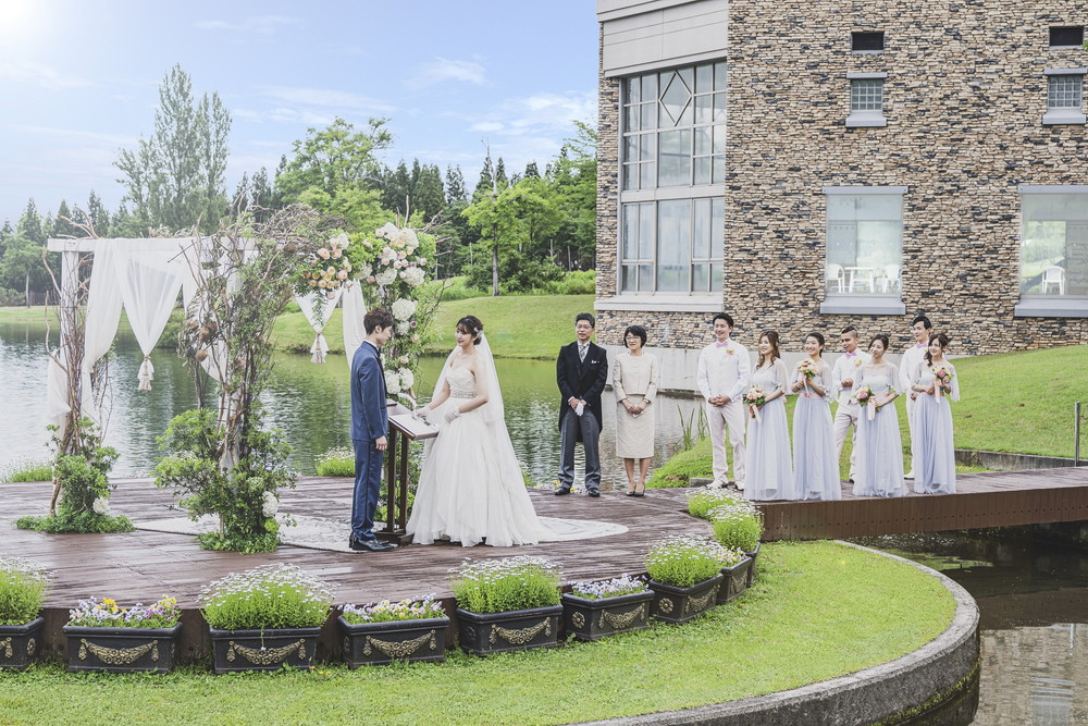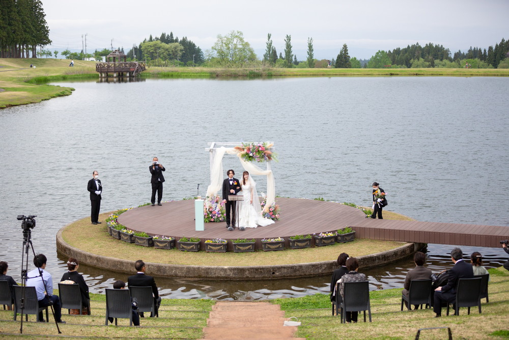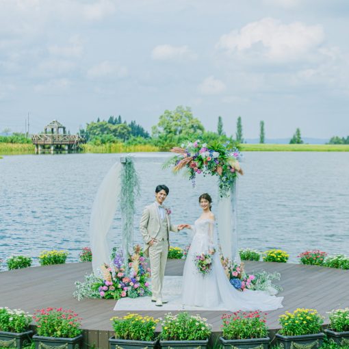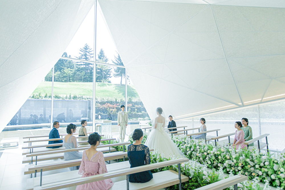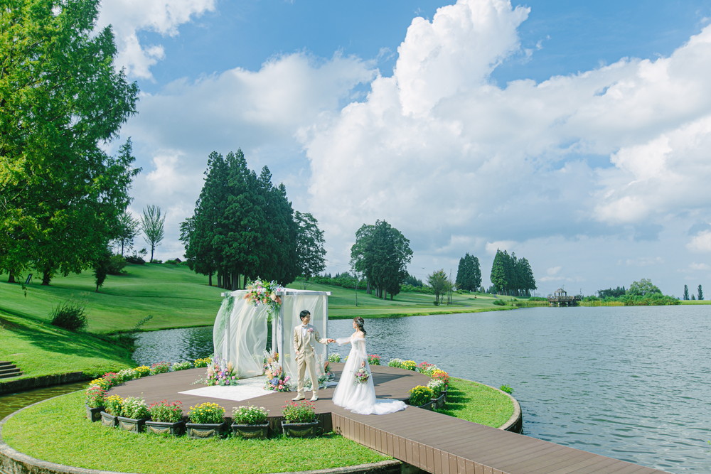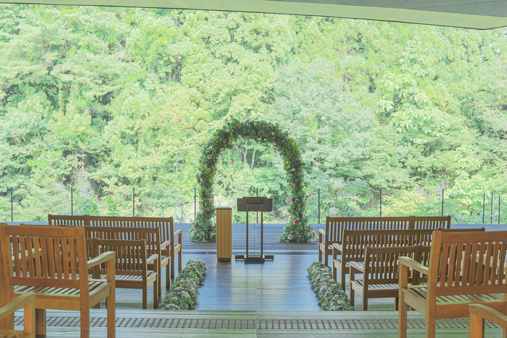 窓から降り注ぐ自然光が印象的なチャペル。開放的な大自然の中での挙式会場。高原の爽やかな風と壮観なロケーションに包まれる湖上のステージ。