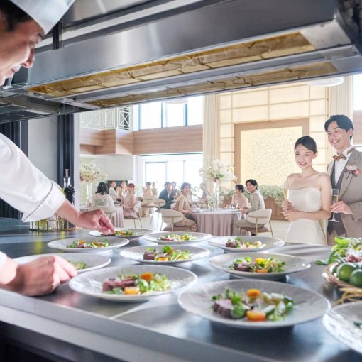 ただ仕上げをするだけのキッチンではなく、パーティ開始と同時にオープンキッチンにて調理が始まります。ベストなタイミングで料理を出せるだけではなく、料理もお二人のパーティの演出の1つになります。