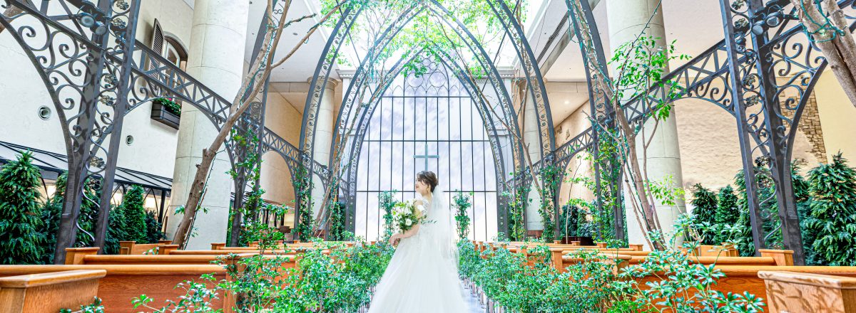 教会式・人前式では、本物のベンジャミンの木と光のあふれる幻想的なチャペル「ルミネール」で、感動の生演奏とともに行います。