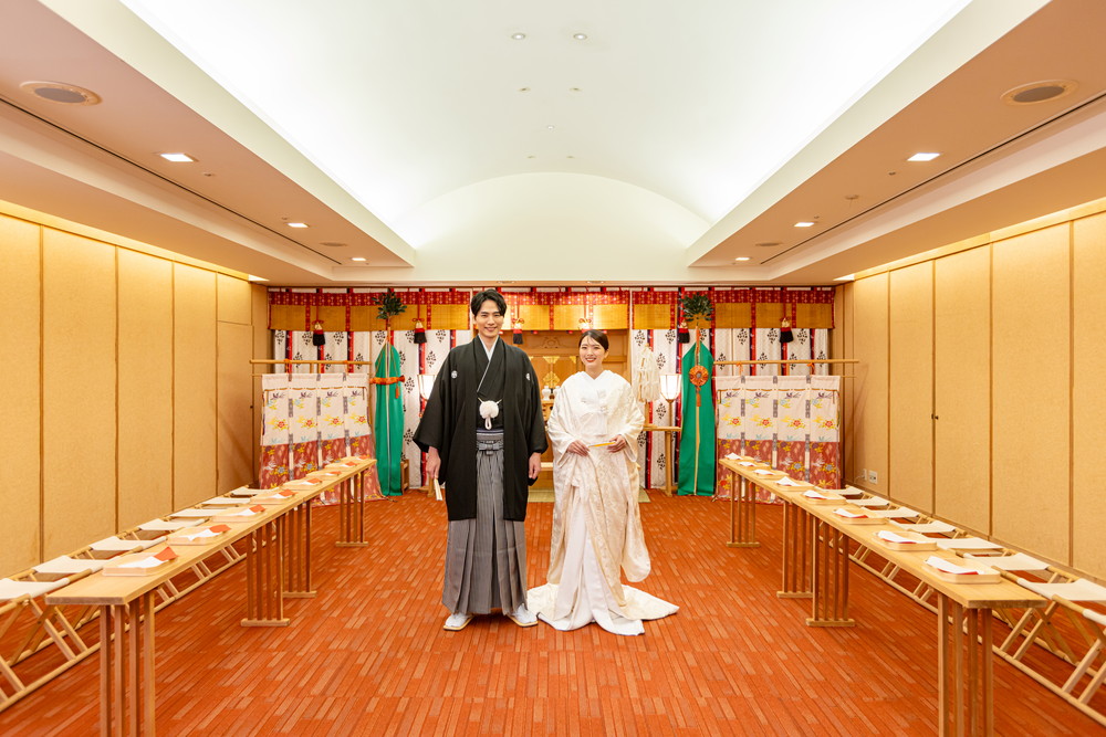 神前式では、出雲大社の流れを汲む神殿(44名着席可能)で、ご親族・ご友人を間近に感じながら伝統ある厳かな挙式を行えます。
