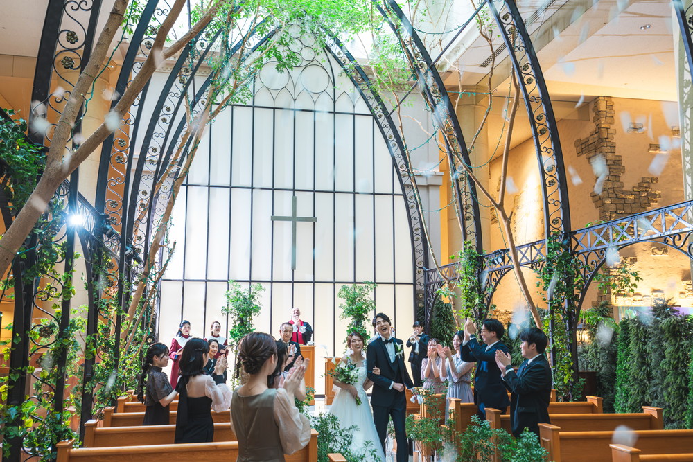 挙式後にはカリオンの鐘が高い吹き抜けに響き渡り、祝福の余韻が心に残ります。